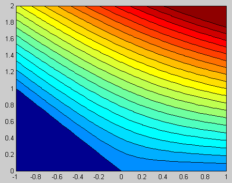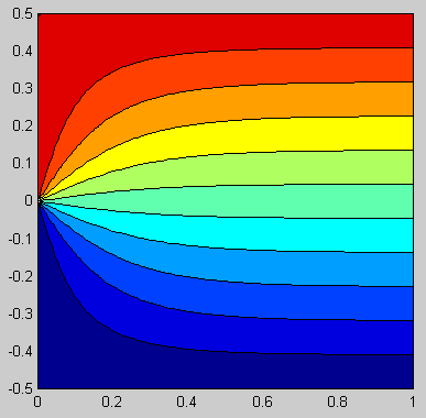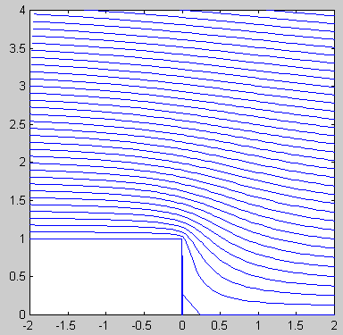 ![]() ![]() Matlab code: A=1; beta=3*pi/4; xlist=-1:0.04:1; ylist=0:0.04:2; [x,y]=meshgrid(xlist,ylist); z=x+1i*y; w=A*z.^(pi/beta); contourf(xlist,ylist,imag(w),0:0.125:2.5); Mathematica code: A = 1; beta = 3Pi/4; alpha = Pi/beta; w[z_] := A z^alpha; ContourPlot[Im[w[x + I y]], {x, -1, 1}, {y, 0, 2}, Contours -> Table[psi, {psi, 0, 2.5, 0.125}], PlotPoints -> 100,ContourShading -> False, AspectRatio -> Automatic]; |