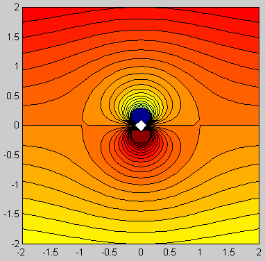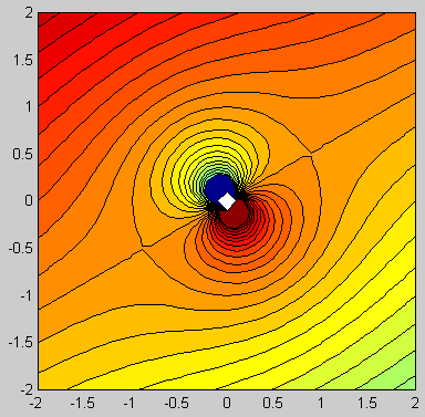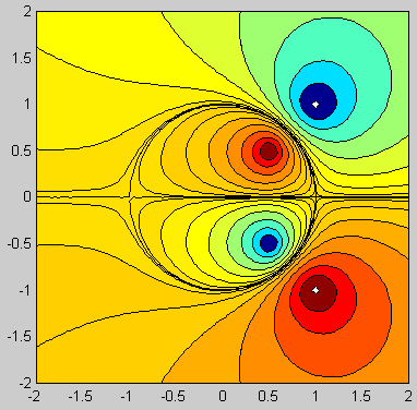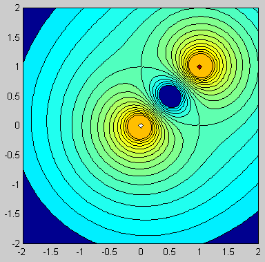 ![]() ![]() Matlab code: gamma=1; a=1; Z=1+1i; xlist=-2:0.04:2; [x,y]=meshgrid(xlist,xlist); z=x+1i*y; w=1i*gamma/(2*pi)*(-log(z-Z)+log(a^2./z-conj(Z))); contourf(xlist,xlist,imag(w),-0.1:0.02:0.2); axis square; Mathematica code: gamma = a = 1; Z = 1 + I; w[z_] := (I gamma/(2Pi))(- Log[z - Z] + Log[a^2/z - Conjugate[Z]]); ContourPlot[Im[w[x + I y]], {x, -2.0, 2.0}, {y, -2.0, 2.0}, Contours -> Table[psi, {psi, -0.1, 0.2, 0.02}], PlotPoints -> 100, ContourShading -> False, AspectRatio -> Automatic]; |