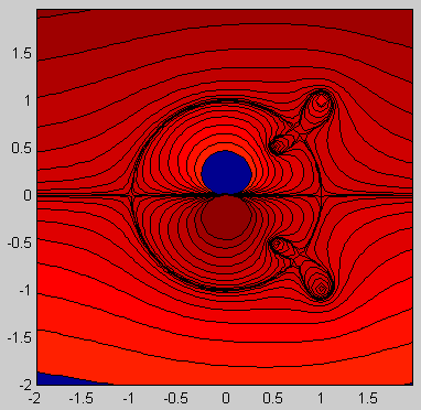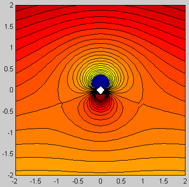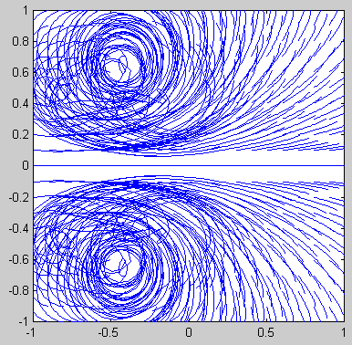 ![]() ![]() Matlab code: U=1; gamma=4; a=1; xlist=-2:0.1:2; [x,y]=meshgrid(xlist,xlist); z=x+1i*y; w=U*(z+a^2./z)+1i*gamma/(2*pi)*log(z); contourf(xlist,xlist,imag(w),-3:0.25:3); axis square; Mathematica code: U = 1; gamma = 4; a = 1; w[z_] := U(z + a^2/z) + (I gamma/(2Pi))Log[z]; ContourPlot[Im[w[x + I y]], {x, -2, 2}, {y, -2, 2}, Contours -> Table[psi, {psi, -3, 3, 0.25}], PlotPoints -> 100, ContourShading -> False, AspectRatio -> Automatic]; |